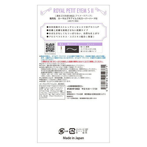備考 パッケージ変更に伴い、2017年6月2日ページリニューアル 【変更箇所】パッケージデザイン・JANコード:4580164050135→4580164050364 区分 化粧品 製造販売元 シロー化学株式会社 発売元 有限会社 ローヤル化研 原産国 日本 広告文責 照和株式会社 TEL:03-3932-5150 商品詳細 商品名 ローヤルプチアイムS II (ROYAL PUTIT EYEM S II)(姉妹品ローヤルプチアイムII) 内容量 (約)4mL 商品サイズ (約)90 mm × 40 mm × 170 mm 成分 ゴムラテックス、(スチレン/アクリル酸アルキル)コポリマーアンモニウム、水、PG、エタノールアミン、アンモニア水、グリチルリチン酸アンモニウム、メチルパラベン、プロピルパラベン、BG、PVP、クオタニウム-73、赤227、アロエベラエキス-1、ユズエキス セット内容 本体(4mL)、専用スティック1本 商品説明 ローヤルプチアイムのスーパーハードタイプ。